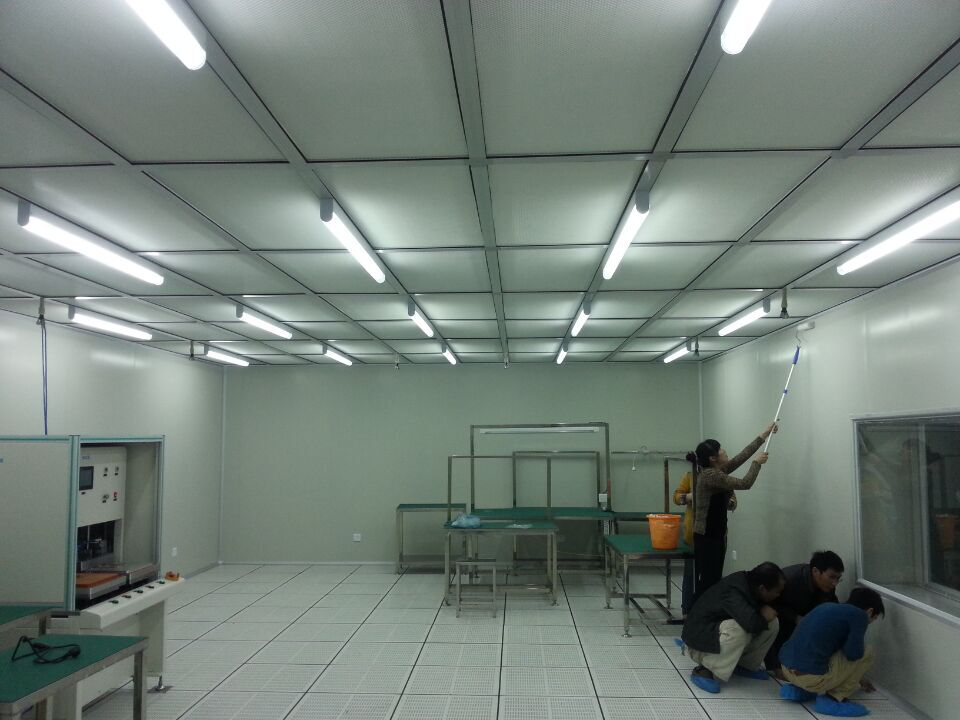 施工單位:凈化車間面積約為1500平方米,凈化要求為百級、千級和萬級,空調(diào)系統(tǒng)方案采用水冷直膨式恒溫恒濕空調(diào)機組+高效風口處理方式,百級采用FFU+AHU方式,工程內(nèi)容含彩鋼板結(jié)構(gòu)裝修,潔凈空調(diào)系統(tǒng),工藝排風,環(huán)氧樹脂地板,LED照明系統(tǒng),空調(diào)配電及自控系統(tǒng),設(shè)計要求:溫度23±2℃,濕度55±5%,完工后各標無塵室指標均達到要求;完工后圖片如下: