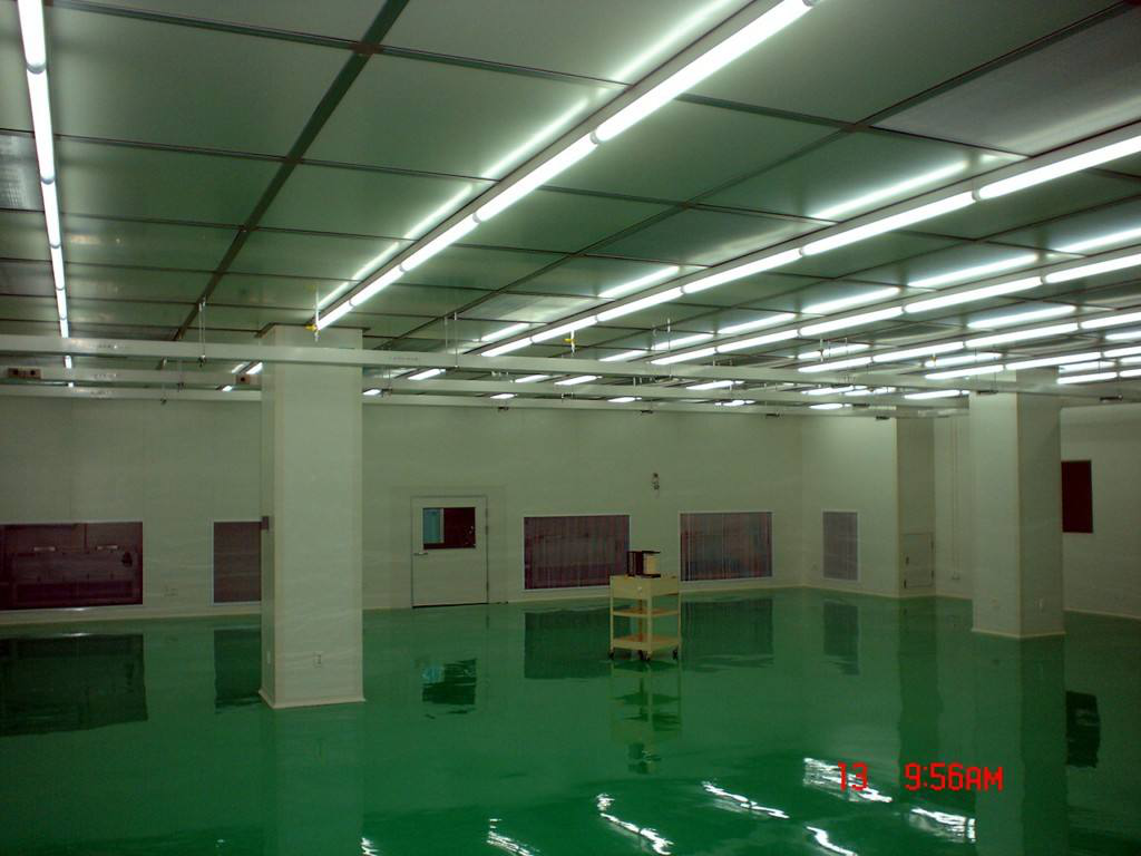 施工單位:凈化車(chē)間面積約為6000平方米,凈化要求為千級(jí)和萬(wàn)級(jí),空調(diào)系統(tǒng)方案采用冷水機(jī)組+潔凈空氣處理機(jī)組AHU+高效風(fēng)口處理方式,工程內(nèi)容含彩鋼板結(jié)構(gòu)裝修,潔凈空調(diào)系統(tǒng),工藝排風(fēng),環(huán)氧樹(shù)脂地板,LED照明系統(tǒng),空調(diào)配電及自控系統(tǒng),鋼構(gòu)系統(tǒng),設(shè)計(jì)要求:溫度23±2℃,濕度55±10%,完工后各標(biāo)無(wú)塵室指標(biāo)均達(dá)到要求;完工后圖片如下: